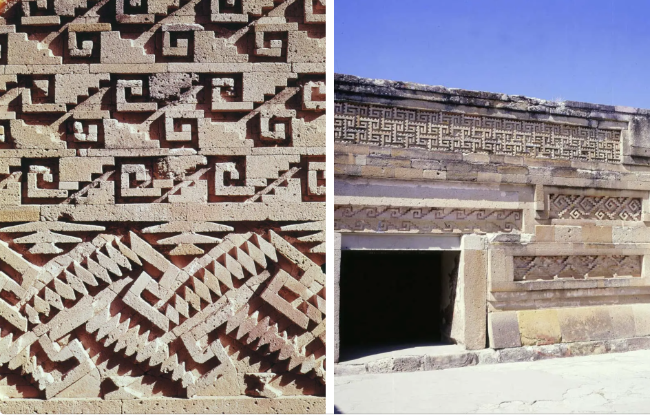 In the next leg of the Greek key journey, the pattern shows up in Central America around 900 BCE. The world is still a place where communication between disparate geographies—Central America, Greece, China—is unlikely. So the pattern may not have passed from one of those cultures to the other, but somehow there it is in Mexico, at the Mitla ruins from 900 BCE.