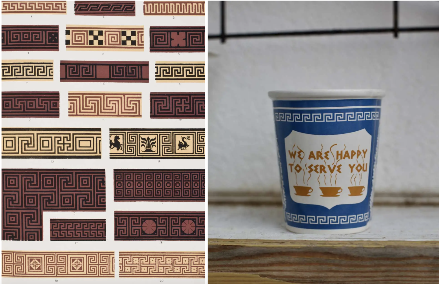 As the Greek key pattern stayed in favor over time, it found its place in increasingly more modern items across Europe and North America. The fret was adopted for design edges and countless decorations. It landed on picture frames, mantle surrounds, shelf brackets, throw pillows, carpets, table legs, sconces, and finally, on paper coffee cups from Greek diners.