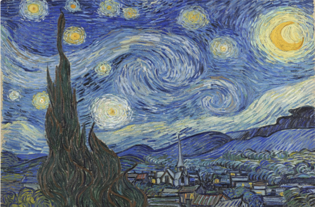 In 1889 Vincent Van Gogh painted stars in thick swirls in The Starry Night. In 1905 Henri-Edmond Cross painted a starry sky using a fantastic mass of dashes. In 1917, Georgia Okeeffe interpreted the night sky in Starlight Night and gave us an altogether modern version of stars, a blanket of dark blue checks. Henri Matisse in his collage Icarus (1947) cut out dangly star shapes from yellow paper.